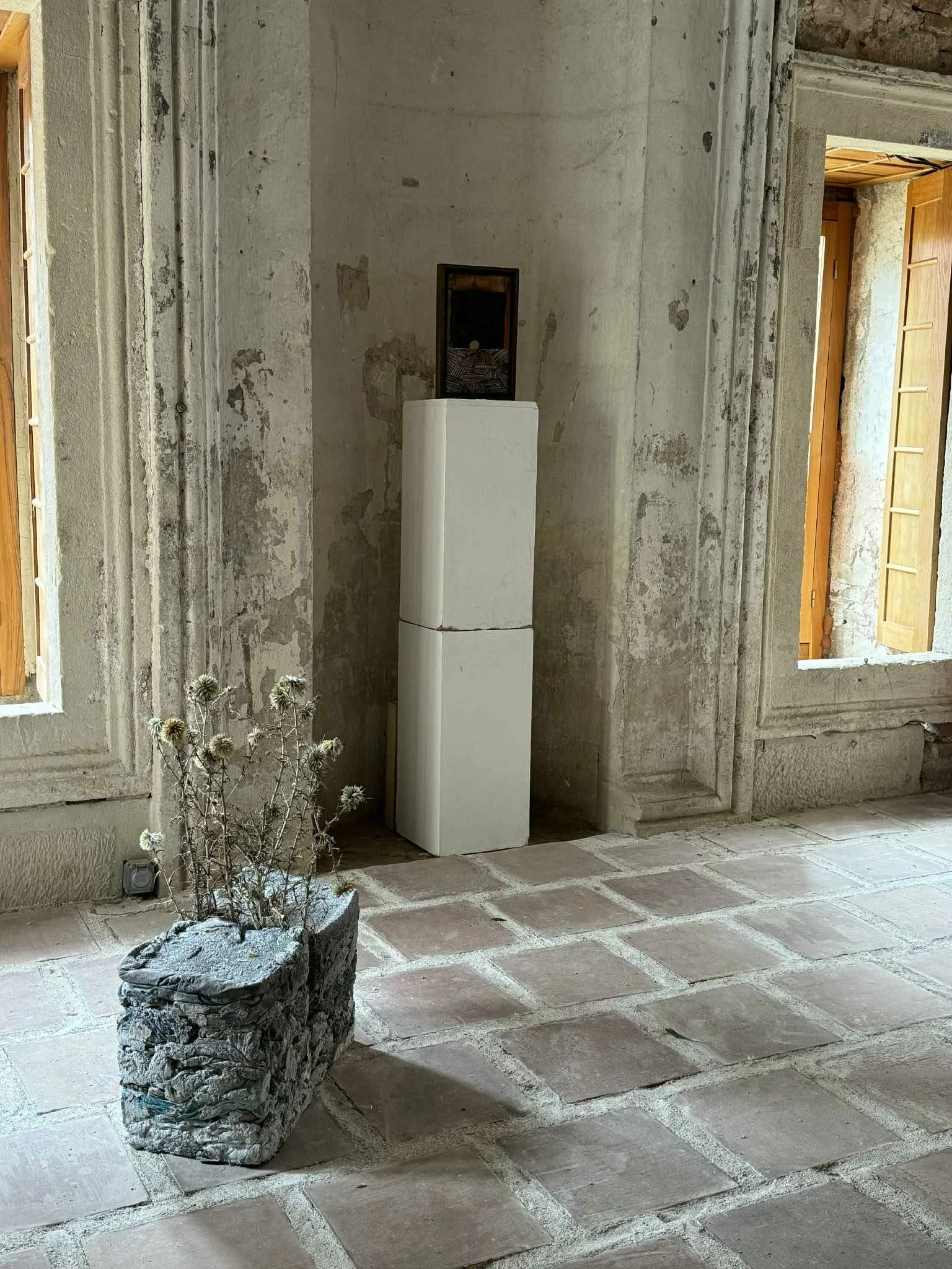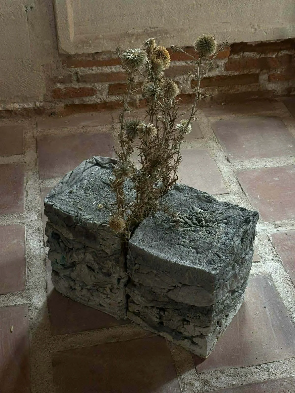 Two compressed piles of clothes, trapped in cement, form a mass that bears the weight of absence. Human traces turned into lifeless matter, testifying to the ravages of war and the violence that dissolves all life. In the centre, a thistle - a plant symbol of resilience - stands out among the mass, albeit withered; nature does not survive here. The work functions as an image of double decay: human existence annihilated by violence and the earth destroyed by the same reckless force. A silent memorial to destruction, but also a reminder of our shared fragility - human and environmental.